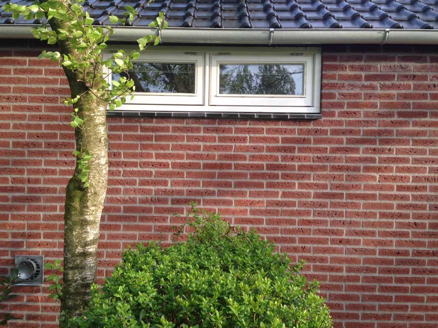 Deze studio en schuur heb ik gevoegd met een vlak volle voeg. Dankzij de wat lichtere voeg krijg je een mooi contrast met het donker geschilderde houtwerk.